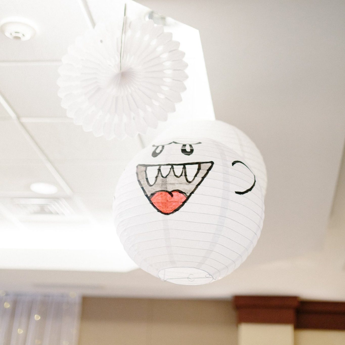 Anyway, it was this shared enjoyment of Mario and the various characters and themes within the games that inspired Luis’s and my wedding’s theme. It was a loose theme, because we didn’t want to give off kids’ birthday party vibes. Our decor was cute! Luis’s sister made paper lanterns with Boo’s face on them. We still have two of them, hanging in our living room.